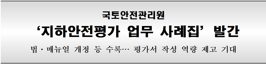 국토안전관리원은 3일 지하안전평가 검토실적을 공유하고 평가서를 작성하는 전문기관(민간업체)에 도움을 주기 위하여 ‘지하안전평가 업무사례집’(사례집)을 발간했다고 밝혔다.