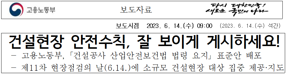 고용노동부와 한국산업안전보건공단은 2023년 6월 14일 제11차 현장점검의 날*을 맞아 소규모 건설현장을 집중 점검하면서 「건설공사 산업안전보건법 법령 요지」 표준안을 배포한다고 말했다.