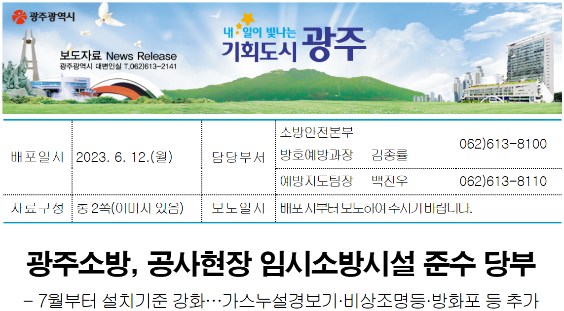 광주광역시소방안전본부는 오는 7월 1일부터 공사현장의 임시소방시설 설치기준이 기존 4종에서 7종으로 강화된다고 12일 밝혔다.