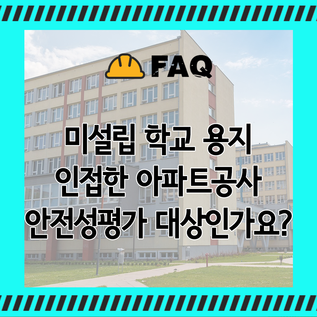 | 「교육시설법」에서 말하는 교육시설은 「유아교육법」, 「초중등교육법」, 「고등교육법」 등에 의해 학교가 설립된 이후의 시설을 말하며, 학교가 설립되기 전 학교시설용지만 있는 경우 교육시설이 아니기 때문에 그 주변 공사장 또한 안전성평가 대상으로 볼 수 없습니다. |